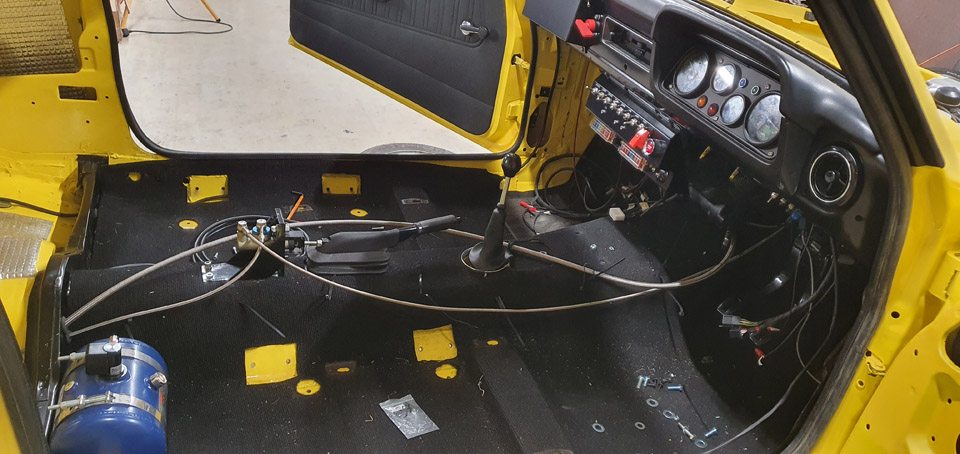 The fire extinguisher I went to great pains to position behind the navigator's footrest is not legal here in Ireland for stage rallying. I'm going to put it behind the drivers seat and move the battery from there to the boot. The oil cooler had to be moved as well as the pipes were not long enough. So much for my dry build!Comment