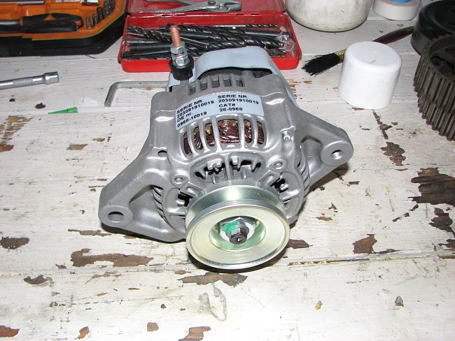 I built the alternator. One light weight alternator with V groove pulley. Took two multi groove pulleys from work to see if they fit the small alternator.